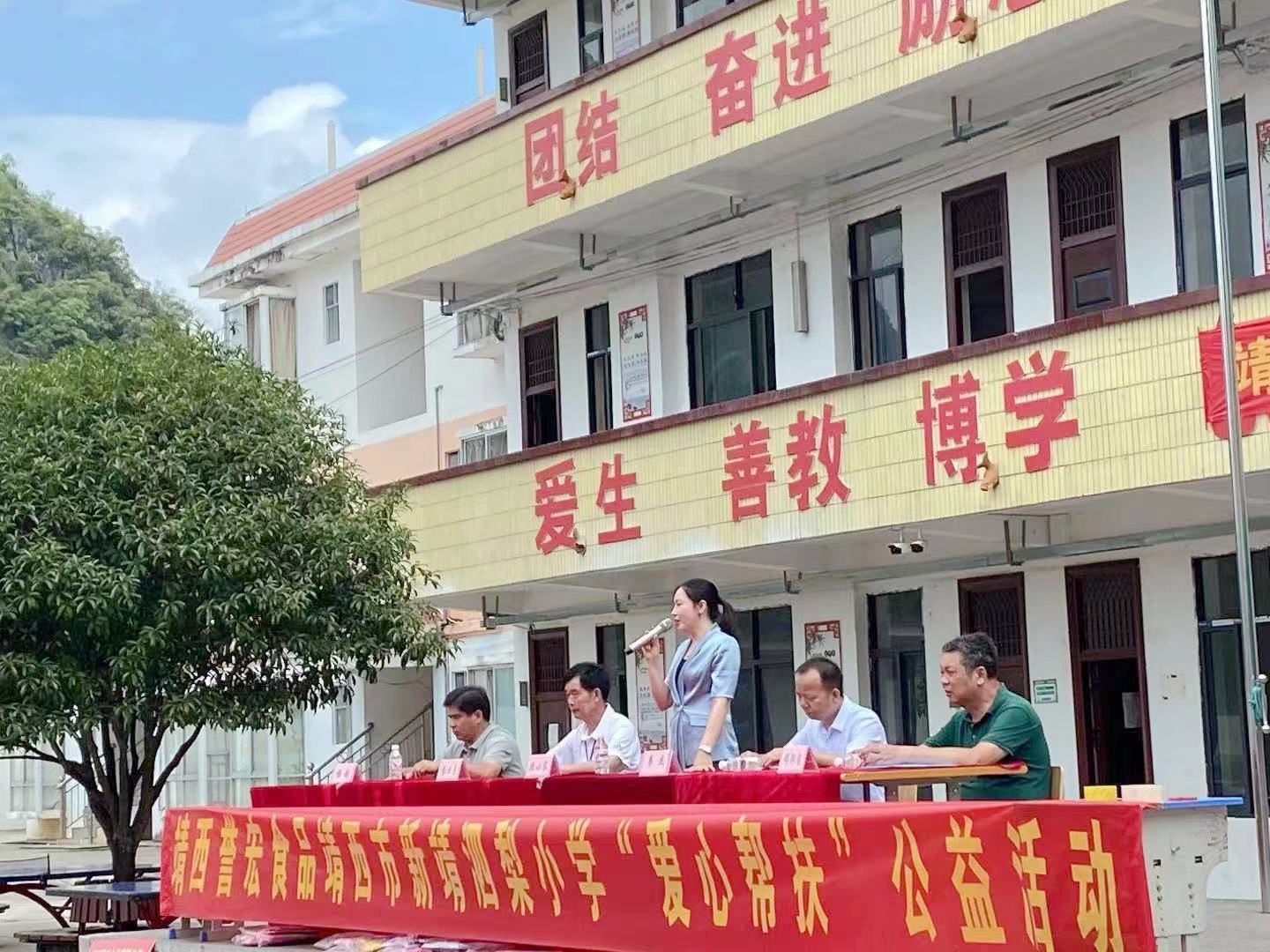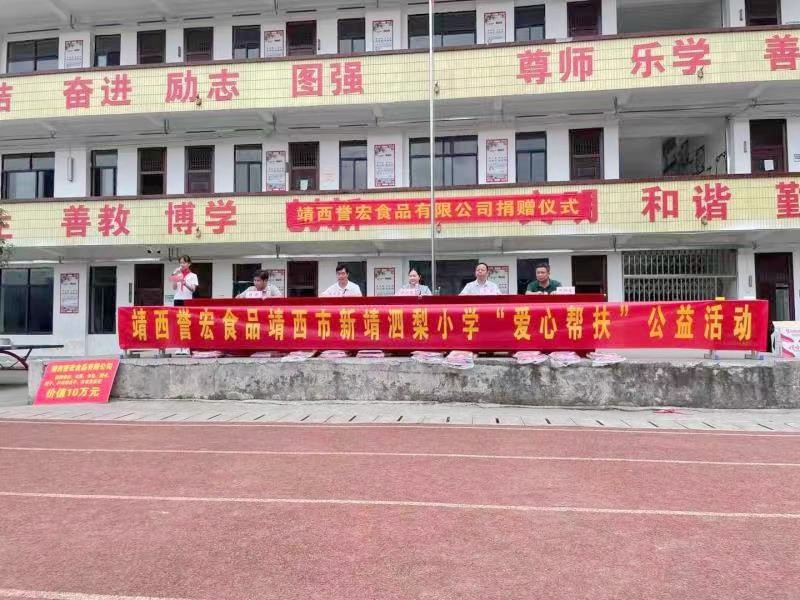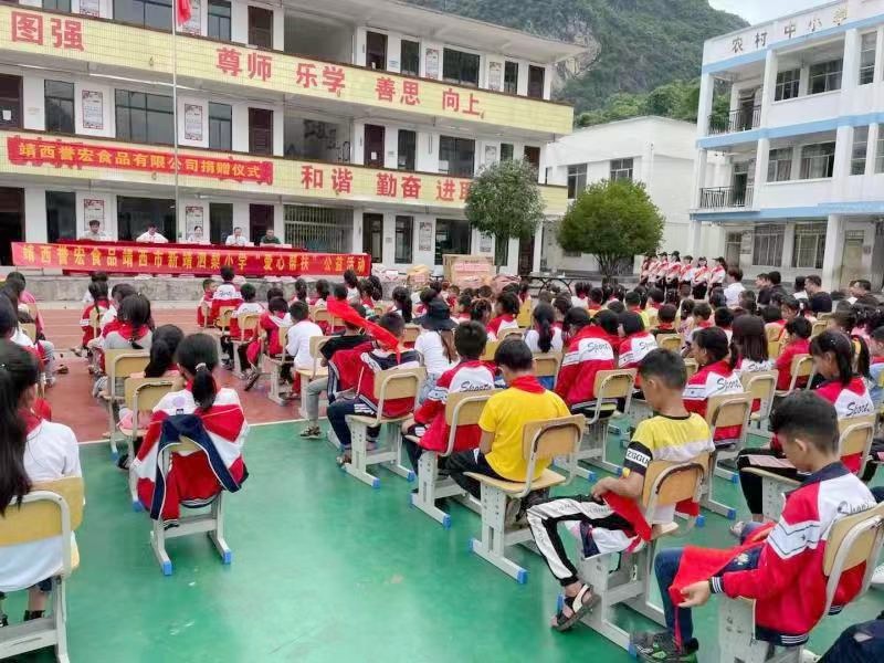 5月27日上午,,,,,6731顶级游戏集团靖西誉宏公司总司理陆小容前往靖西市新靖镇泗梨小学开展“爱心帮扶”物资捐赠运动,,,,,向农村学校的孩子们捐赠书包、图书、帽子、乒乓球桌子、体育用品等价值10万元物资。。。。。。。