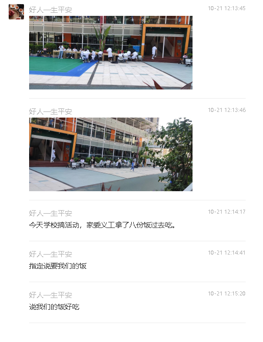 午餐时间,,,,,,,先生们都会打一份与学生一样的饭菜,,,,,,,与学生坐在一起同食同餐。。。。。。。在用餐时代,,,,,,,先生们会时时地询问学生的用餐情形,,,,,,,“今天的饭菜合胃口吗??????”“多吃点肉和绿叶菜”“要注重营养平衡”........
